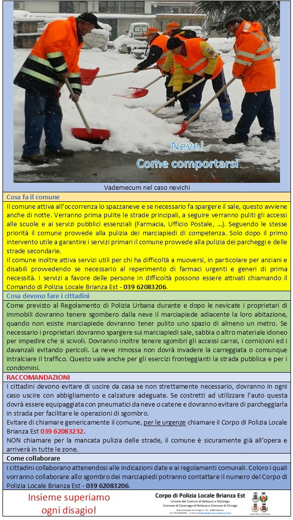 Si invita la cittadinanza a contribuire attivamente al piano neve comunale tenendo puliti i marciapiedi e i passaggi pedonali direttamente confinanti con le proprie proprietà come da art. 22 del regolamento di polizia urbana.