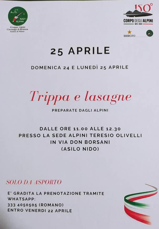 asporto presso la sede degli alpini (Via Don Borsani c/o Asilo Nido)