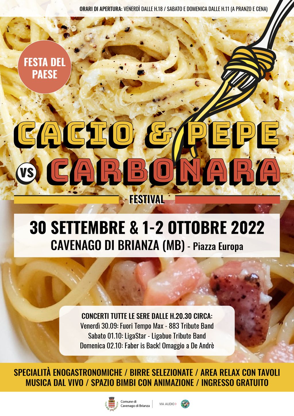 Continuano gli appuntamenti enogastronomici: a Cavenago di Brianza (MB) per la Festa del Paese, in scena dal 30 Settembre al 2 Ottobre 2022 la 15° edizione del "Cacio & Pepe VS Carbonara Festival", il grande format itinerante dedicato alla Cucina Romana, per un lungo weekend di gusto e divertimento da non perdere nella centrale Piazza Europa!