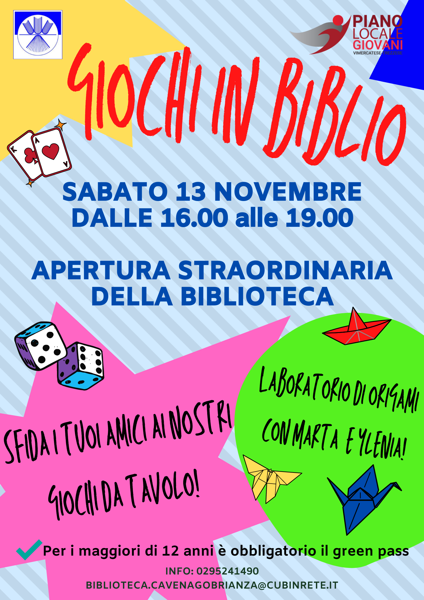 Vi aspettiamo sabato 13 novembre dalle 16.00 alle 19.00 in biblioteca, per sfidare parenti e amici ai nostri giochi da tavolo e per partecipare al super laboratorio di origami di Marta e Ylenia!