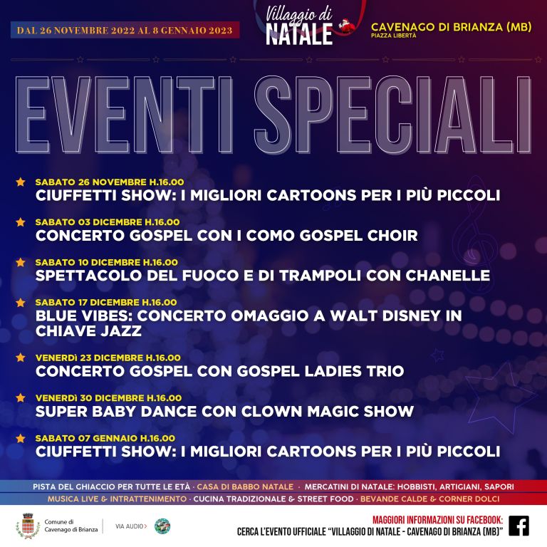 Tornano la magia e la luce del Natale in città: a Cavenago di Brianza (MB) si fa festa aspettando il momento più atteso dell'anno! Dal 26 Novembre 2022 al 8 Gennaio 2023 oltre un mese di appuntamenti da non perdere tra gusto e divertimento, con musica e spettacoli, animazione e mercatini natalizi, cucina tradizionale e vin brulè, oltre alla casa di Babbo Natale ed alla stupenda Pista del Ghiaccio - per i più piccoli e non solo!